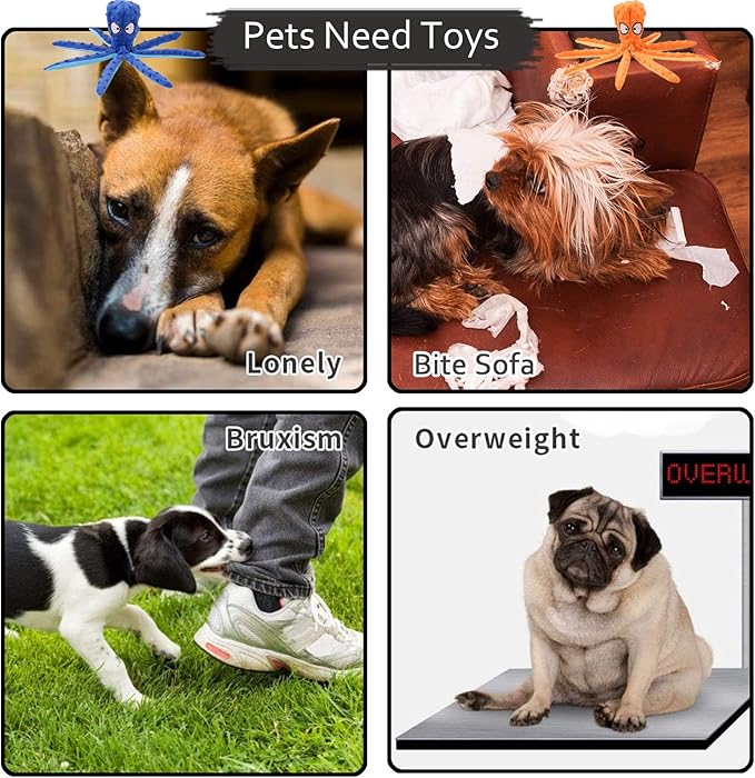 Octopus squeaky toys are made of safe and premium plush polyester fibers, and there is no filling inside, so there is no need to worry about dogs swallowing or suffocating while playing. Cute octopus dog toys come in set of 4 bright color (blue, green, orange, purple), Vibrant colors will attract your dog’s interest and keep them entertained. Our squeaky toys for dogs are loaded with 2 interactive in head and tail, which will deliver stereo sound effect that's ideal for interactive train & play.